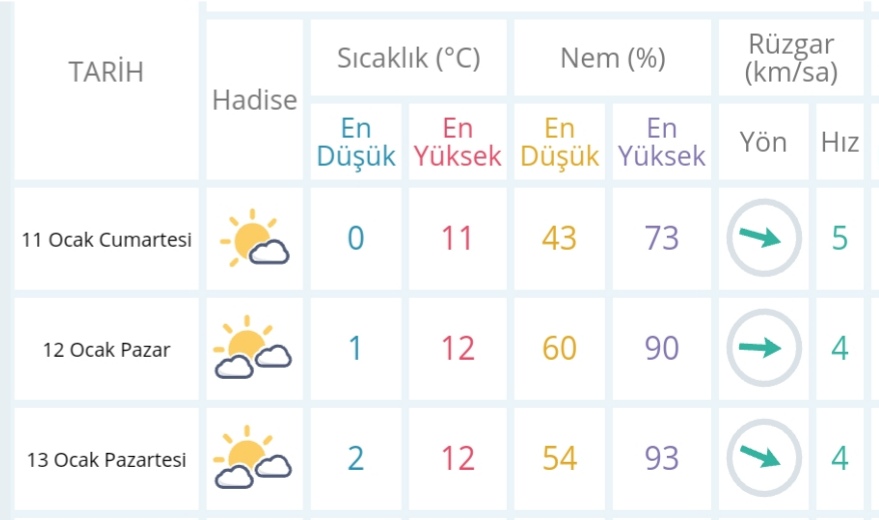11 Ocak Cumartesi günü en düşük sıcaklık 5 derece, en yüksek sıcaklık ise 8 derece güneşli parçalı bulutlu olacak.