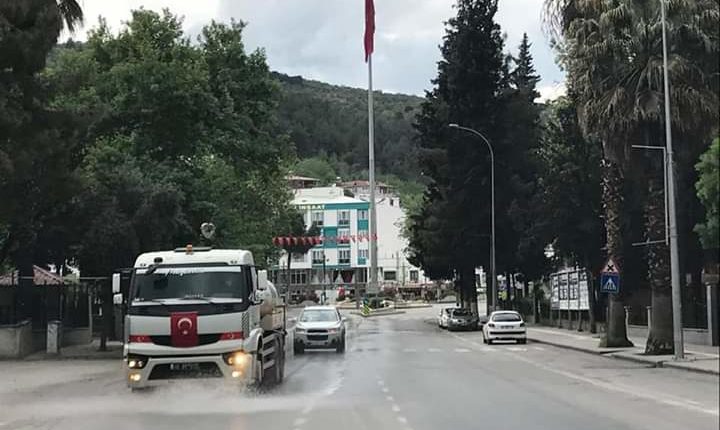 Kahramanmaraş’ın Türkoğlu ilçesinde sokağa çıkma yasağı uygulamasının olduğu hafta sonunda cadde ve sokaklarda dezenfekte çalışmaları devam ediyor.