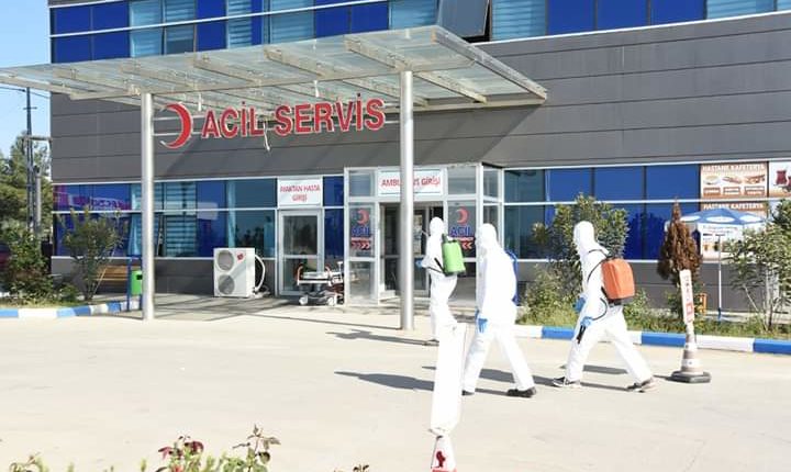 Korona virüsü tedbirleri kapsamında Kahramanmaraş’ın Türkoğlu ilçesinde bulunan Devlet Hastanesinde dezenfekte işlemleri periyodik olarak devam ediyor.