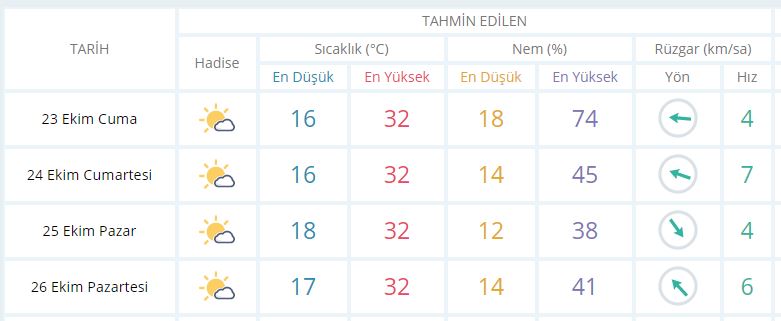 24 Ekim Cumartesi günü en düşük sıcaklık 16 derece, en yüksek sıcaklık ise 32 derece açık ve sıcak olacak.