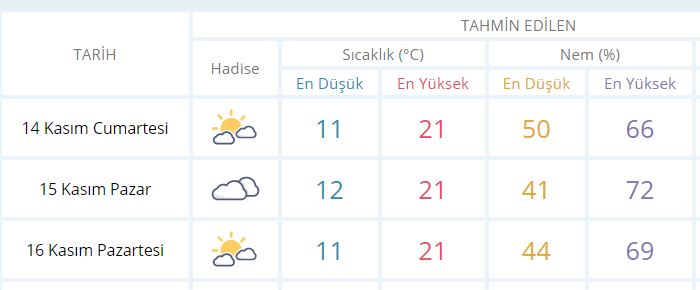 15 Kasım Pazar günü en düşük sıcaklık 12 derece, en yüksek sıcaklık ise 21 derece bulutlu olacak.