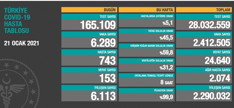 Son dakika haberi: Sağlık Bakanlığı tarafından 21 Ocak koronavirüs tablosu, vaka, hasta, test, vefat sayısı ve son durum açıklandı. Türkiye’de son 24 saatte 165 bin 109 Kovid-19 testi yapıldı, 6 bin 289 kişinin testi pozitif çıktı, 153 kişi hayatını kaybetti.
