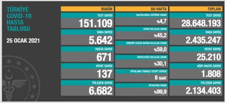 Sağlık Bakanlığı tarafından 25 Ocak koronavirüs tablosu, vaka, hasta, test, vefat sayısı ve son durum açıklandı.