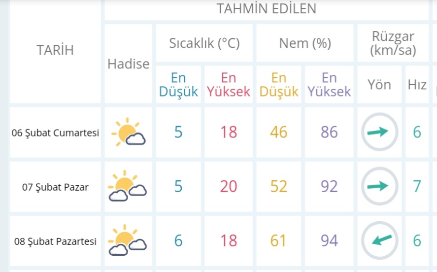 6 Şubat. Cumartesi günü en düşük sıcaklık 5 derece, en yüksek sıcaklık ise 18 derece açık az bulutlu olacak.