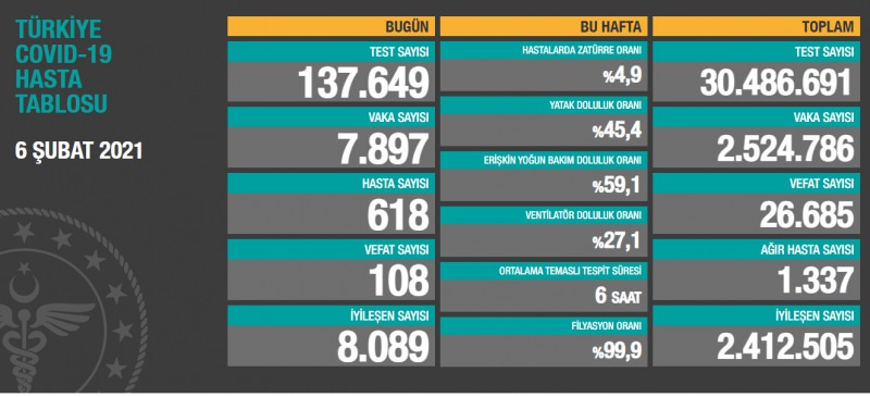 Toplamda 30 milyon 386 bin 691 test yapıldı. Bugün yapılan 137 bin 649 testten, 7 bin 897 yeni vaka sayısı, 618 de yeni hasta sayısı olduğu belirtildi. Toplam vaka sayısının 2 milyon 524 bin 786 olduğu, bugün iyileşen 8 bin 089 kişiyle birlikte toplam iyileşen hasta sayısının 2 milyon 412 bin 505’e yükseldiği, toplam hastalarda zatürre oranının yüzde 4,9, ağır hasta sayısının ise 1 bin 337 olduğu açıklandı.