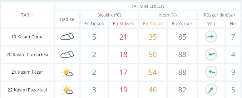 21 Kasım Pazar günü en düşük sıcaklık 2 derece, en yüksek sıcaklık ise 17 derece açık az bulutlu olacak.