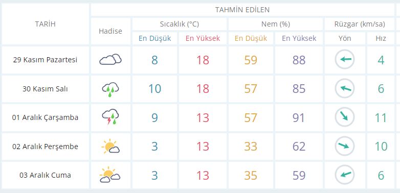 29 Kasım Pazartesi günü en düşük sıcaklık 8 derece, en yüksek sıcaklık ise 18 derece bulutlu olacak.