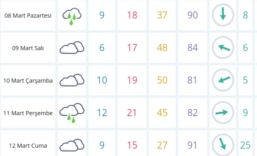 8 Mart Pazartesi günü en düşük sıcaklık 9 derece, en yüksek sıcaklık ise 18 derece yağışlı olacak.
