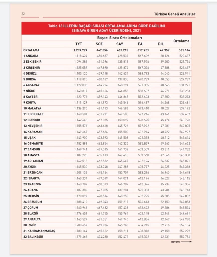 Diğer yandan sınava giren tüm adaylar üzerinden yapılan değerlendirmede 520 bin ortalama başarı sıralaması ile Ankara, Eskişehir, Kırşehir, Denizli ve Bursa en başarılı iller; 614-628 bin ortalama başarı sıralaması ile Şırnak, Ardahan, Artvin ve Hakkari ise en başarısız iller oldu.