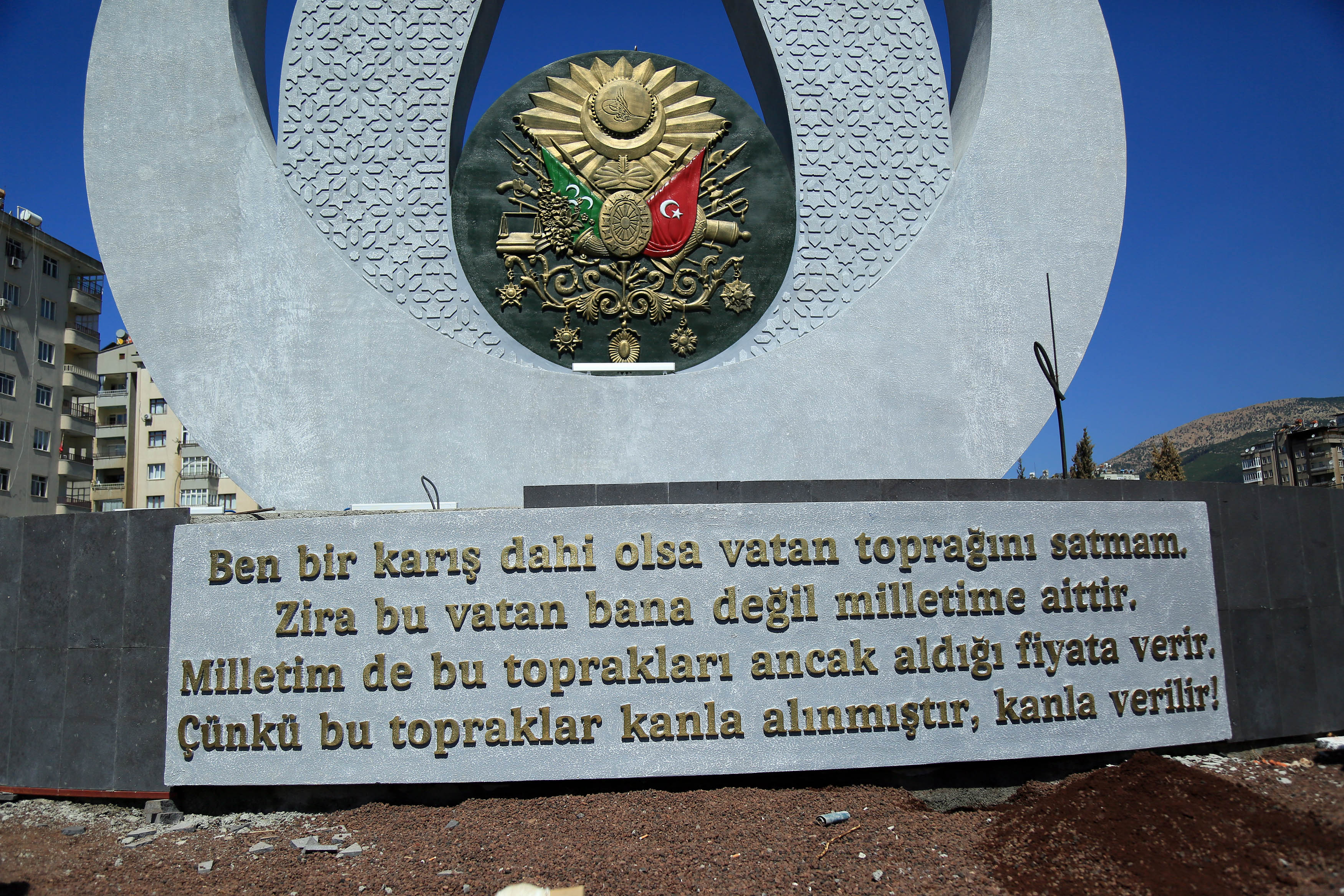 Kaidenin üzerine; iki tarafa Abdülhamit Han’ın meşhur sözü olan; “bir karış dahi olsa vatan toprağını satmam, zira bu vatan bana değil milletime aittir. Milletim de bu toprakları ancak aldığı fiyata verir. Çünkü bu topraklar kanla alınmıştır, kanla verilir!” sözü yazılmış diğer iki tarafa da Kahramanmaraş Büyükşehir Belediyesi’nin logosu işlenmiştir.