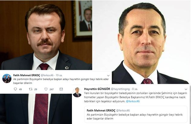 Kahramanmaraş Büyükşehir Belediye Başkanı Fatih Mehmet Erkoç ve AK Parti Kahramanmaraş Büyükşehir Belediye Başkan adayı Hayrettin Güngör sosyal medya üzerinden birbirlerini tebrik ve teşekkür ettiler.