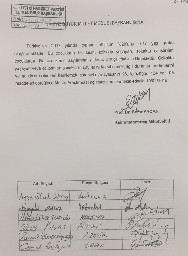Aycan “Türkiye genelinin büyük bir bölümünü 0-17 yaş grubu oluşturmaktadır. Bu çocukların bir kısmı sokakta yaşayan ve sokakta çalıştırılan çocuklardır. Sayılarının giderek arttığı ifade edilmektedir. Sokakta yaşayan ve çalıştırılan çocukların sayılarını tespit etmek, ilgili durumun nedenlerini bulmak ve gereken önlemleri belirlemek amacıyla Meclis Araştırması yapılmasını istedik.” dedi.