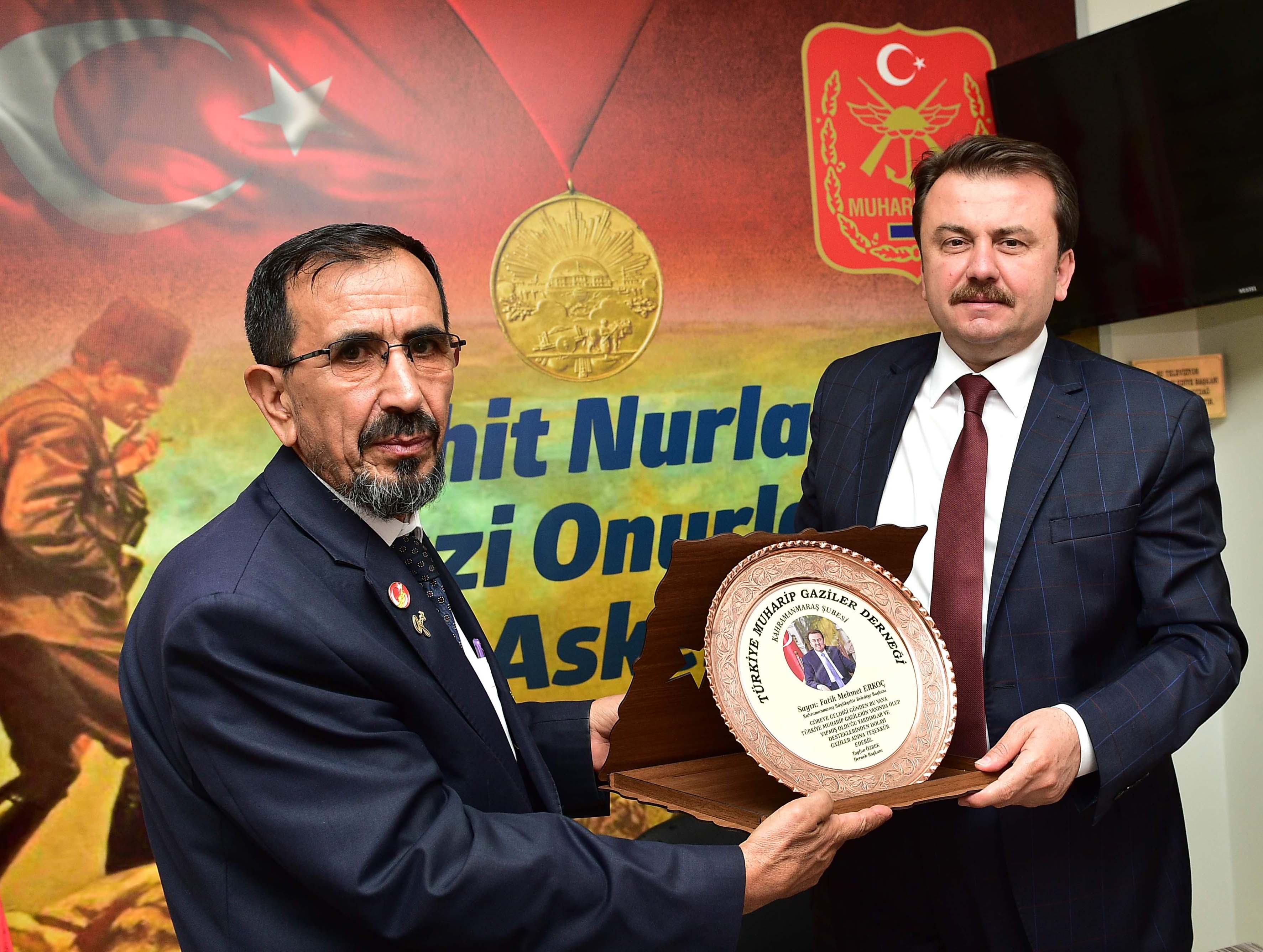 Ziyaretten oldukça memnun olduklarını ifade eden Türkiye Muharip Gazileri Derneği Kahramanmaraş Şube Başkanı Tayfun Özbek; üzerinde “Başkanımız göreve geldiği günden bu yana Muharip Gazilerin yanında yer almış olup yaptığı yardım ve desteklerden dolayı kendisine teşekkür ediyoruz” yazılı ve Başkan Erkoç’un resmi bulunan plaketi takdim ederek teşekkür etti.