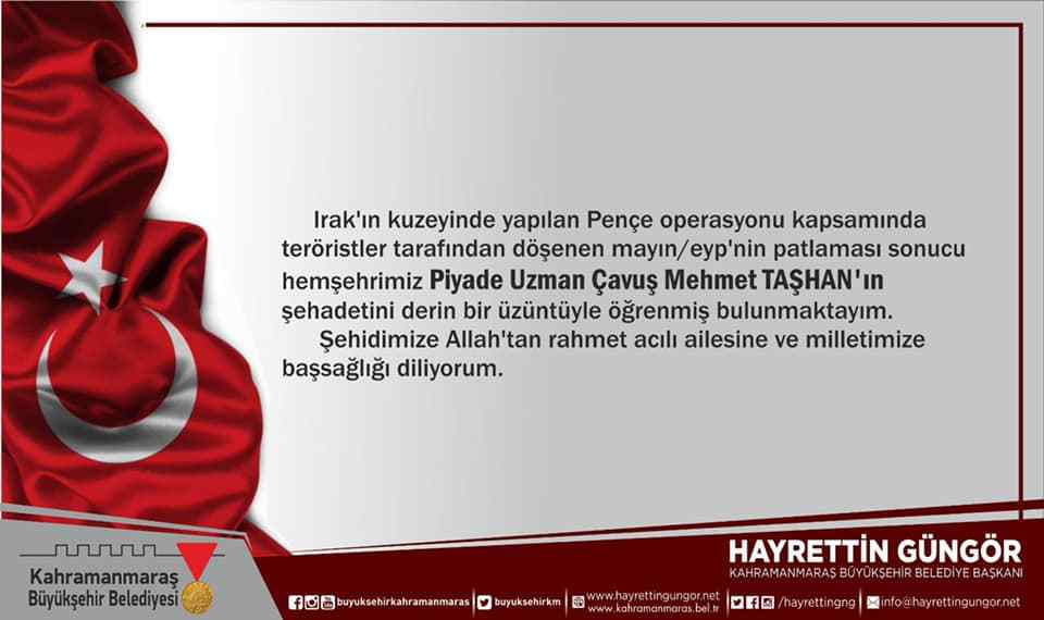 Kahramanmaraş Büyükşehir Belediye Başkanı Hayrettin Güngör, Irak’ın kuzeyinde devam eden operasyonlarda şehit olan Piyade Uzm. Çvş. Mehmet Taşhan için bir taziye mesajı yayınladı.