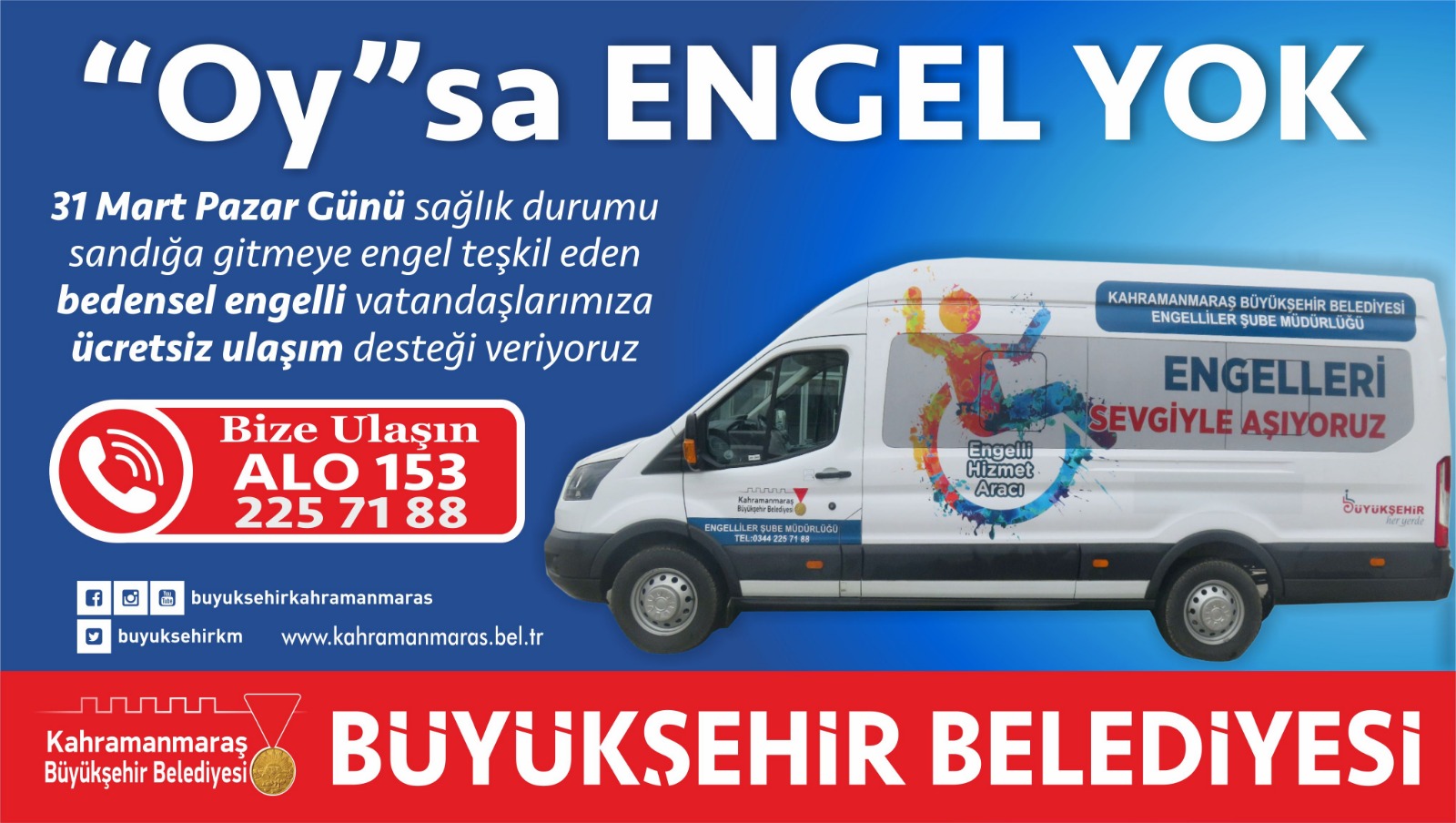 Kahramanmaraş Büyükşehir Belediyesi Engelli Hizmetleri Şube Müdürlüğü’nce yürütülecek hizmette bedensel engelli olan vatandaşların oy kullanma işlemini gerçekleştirebilmesi adına randevu alınması durumunda evlerinden alınıp, oy kullanma işlemi sonrasında tekrardan evlerine bırakılacak.