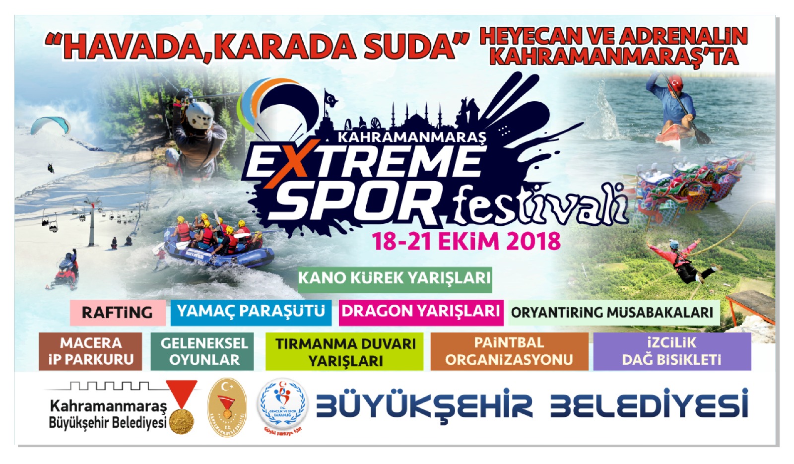 Kahramanmaraş’ta 18-21 Ekim 2018 tarihleri arasında gerçekleştirilecek Ekstrem Spor Festivali, Rafting, Yamaç Paraşütü, Kano Kürek Yarışları, Dragon yarışları, Oryantring Müsabakaları, 22 Oyunlu Macera Parkı Yarışları, Tırmanma Duvar Yarışları, Paintbal organizasyonunu kapsıyor.