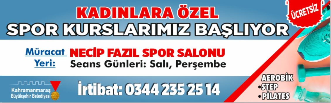 Kahramanmaraş Büyükşehir Belediyesi tarafından kadınlara yönelik 4 branşta açılan spor kurslarına kayıt başladı. Kültür Spor ve Turizm Dairesi Başkanlığı Gençlik ve Spor Şube Müdürlüğü tarafından Osman Sayın ve Necip Fazıl Spor Salonlarında gerçekleştirilecek kurslarda aerobik, step, fitness ve plates seansları yapılacak.