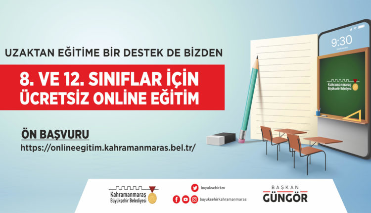 Kahramanmaraş Büyükşehir Belediyesi, pandemi nedeniyle ara verilen eğitim öğretim yılında sınavlara hazırlanan 8. ve 12. sınıf öğrencilerine yönelik Ücretsiz Çevrimiçi Eğitim Projesi’ni hayata geçiriyor. Bu kapsamda, Liseye Geçiş Sınavı’na (LGS) girecek 8. sınıf öğrencilerine ve Yükseköğretime Giriş Sınavı’na (YKS) girecek 12. sınıf öğrencilerine yönelik, 300 bin soru ve çözüm videolarının yanı sıra uzman eğitmenler tarafından hazırlanan konu anlatım videolarını da içeren online eğitim sistemi kuruluyor.