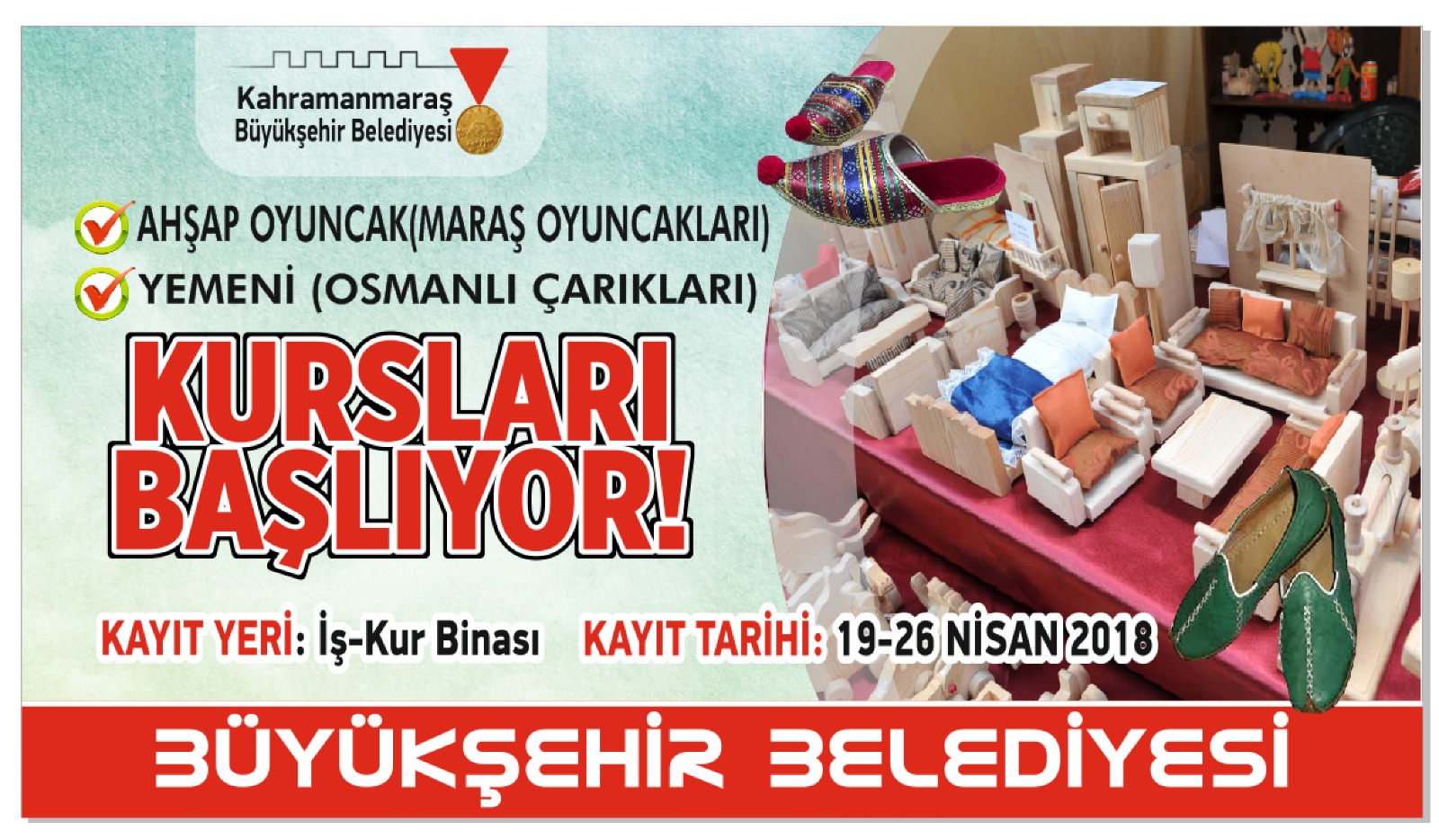 Kahramanmaraş Büyükşehir Belediyesi ve İş-Kur Müdürlüğü işbirliği ile düzenlenecek olan Ahşap Oyuncak (Maraş Oyuncakları) ve Yemeni(Osmanlı Çarıkları) Kurslarına başvurular 19-26 Nisan 2018 tarihleri arasında yapılacak.