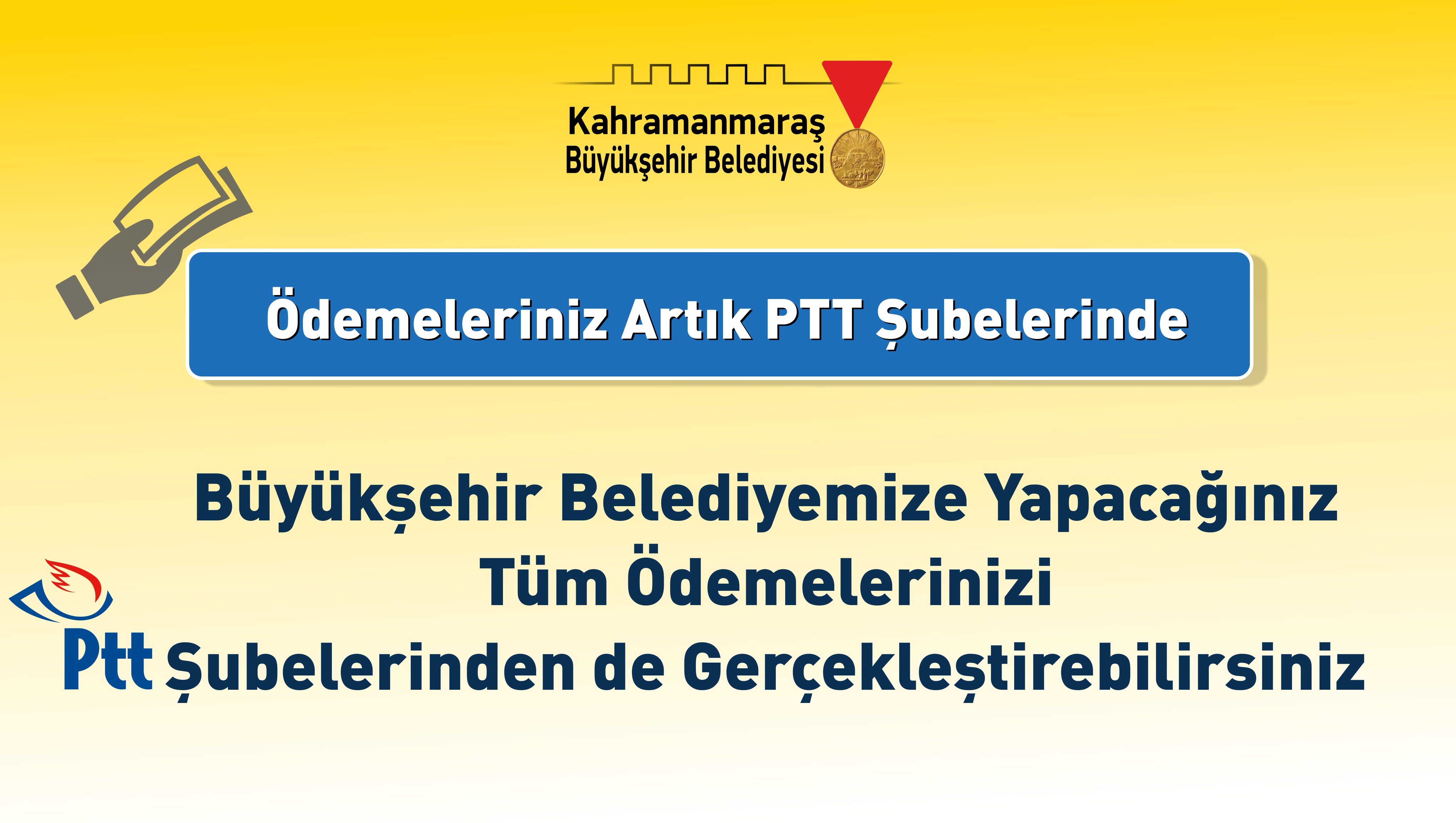 Kahramanmaraş Büyükşehir Belediyesi ile PTT arasında imzalanan protokol gereği Kahramanmaraş Büyükşehir Belediyesine herhangi bir borçtan dolayı ödeme yapması gereken vatandaşlar kendilerine en yakın PTT Şube Müdürlüğüne giderek ödemelerini yapabilecekler.