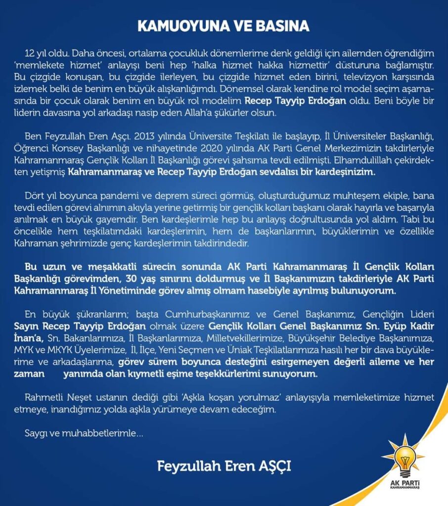 Dört yıl boyunca pandemi ve deprem süreci görmüş, oluşturduğumuz muhteşem ekiple, bana tevdi edilen görevi alnımın akıyla yerine getirmiş bir gençlik kolları başkanı olarak hayırla ve başarıyla anılmak en büyük gayemdir. Ben kardeşlerimle hep bu anlayış doğrultusunda yol aldım. Tabi bu öncelikle hem teşkilatımdaki kardeşlerimin, hem de başkanlarımın, büyüklerimin ve özellikle Kahraman şehrimizde genç kardeşlerimin takdirindedir. Bu uzun ve meşakkatli sürecin sonunda AK Parti Kahramanmaraş İl Gençlik Kolları Başkanlığı görevimden, 30 yaş sınırını doldurmuş ve İl Başkanımızın takdirleriyle AK Parti Kahramanmaraş İl Yönetiminde görev almış olmam hasebiyle ayrılmış bulunuyorum.