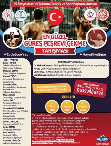 Covid-19 salgını ile mücadele kapsamında sokağa çıkma kısıtlaması neticesinde evde kalan insanlarımıza spor yaptırmak adına Dulkadiroğlu Belediyesi, Türkiye Geleneksel Spor Dalları Federasyonu Başkanlığı ve Kahramanmaraş Gençlik Hizmetleri ve Spor İl Müdürlüğünce Türkiye’de bir ilk olarak evde “En Güzel Güreş Peşrevi Çekme Yarışması” düzenlenecektir.