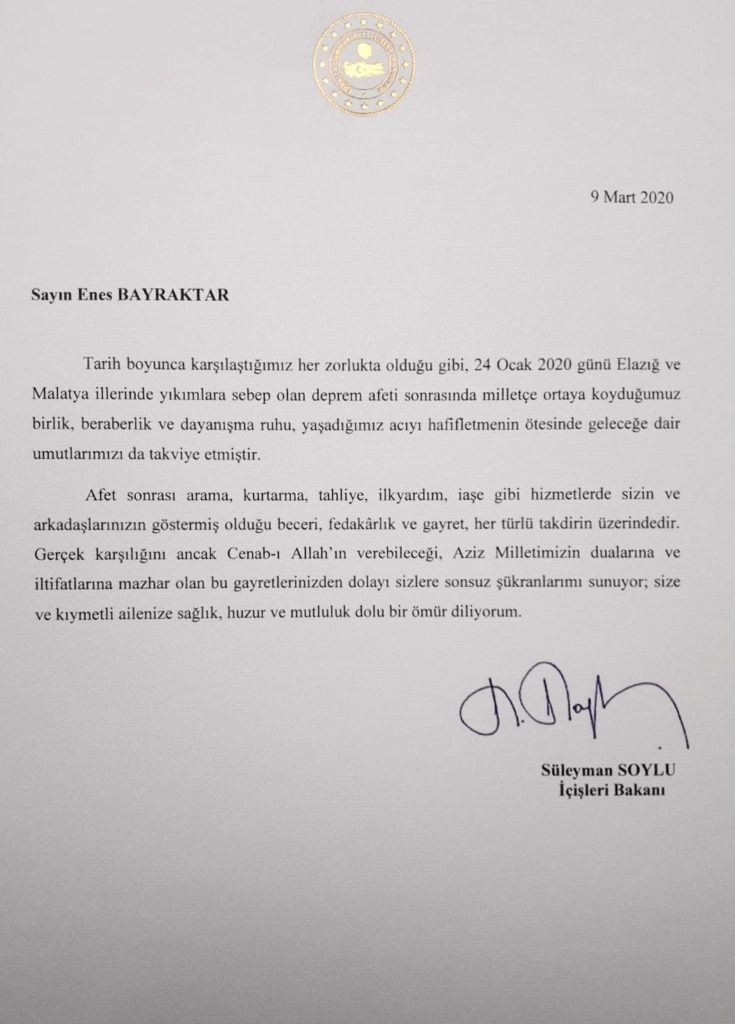 İçişleri Bakanı Süleyman Soylu imzası ile isme gönderilen mektupta; “Tarih boyunca karşılaştığımız her zorlukta olduğu gibi 24 Ocak 2020 günü Elazığ ve Malatya illerinde yıkımlara sebep olan deprem afeti sonrasında milletçe ortaya koyduğumuz birlik, beraberlik ve dayanışma ruhu, yaşadığımız acıyı hafifletmenin ötesinde geleceğe dair umutlarımızı da takviye etmiştir.