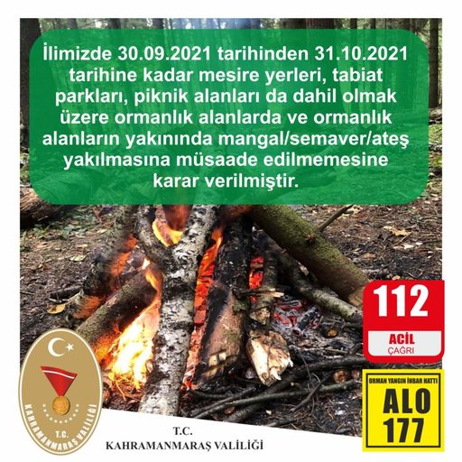 Kahramanmaraş Valiliği, Ekim ayı boyunca İl genelinde Orman ve ormanlık alanlarda ateş yakılmasını yasakladı.