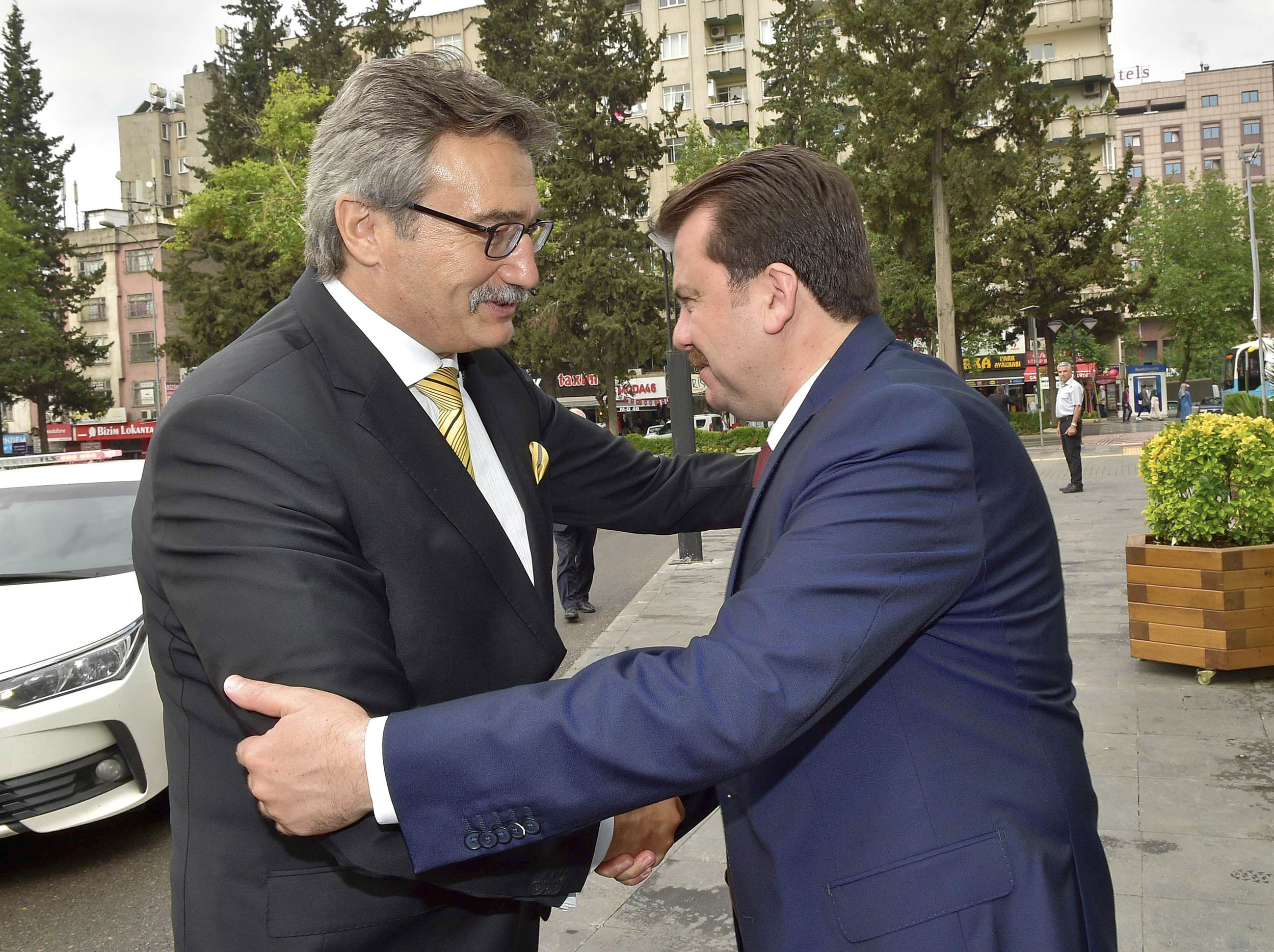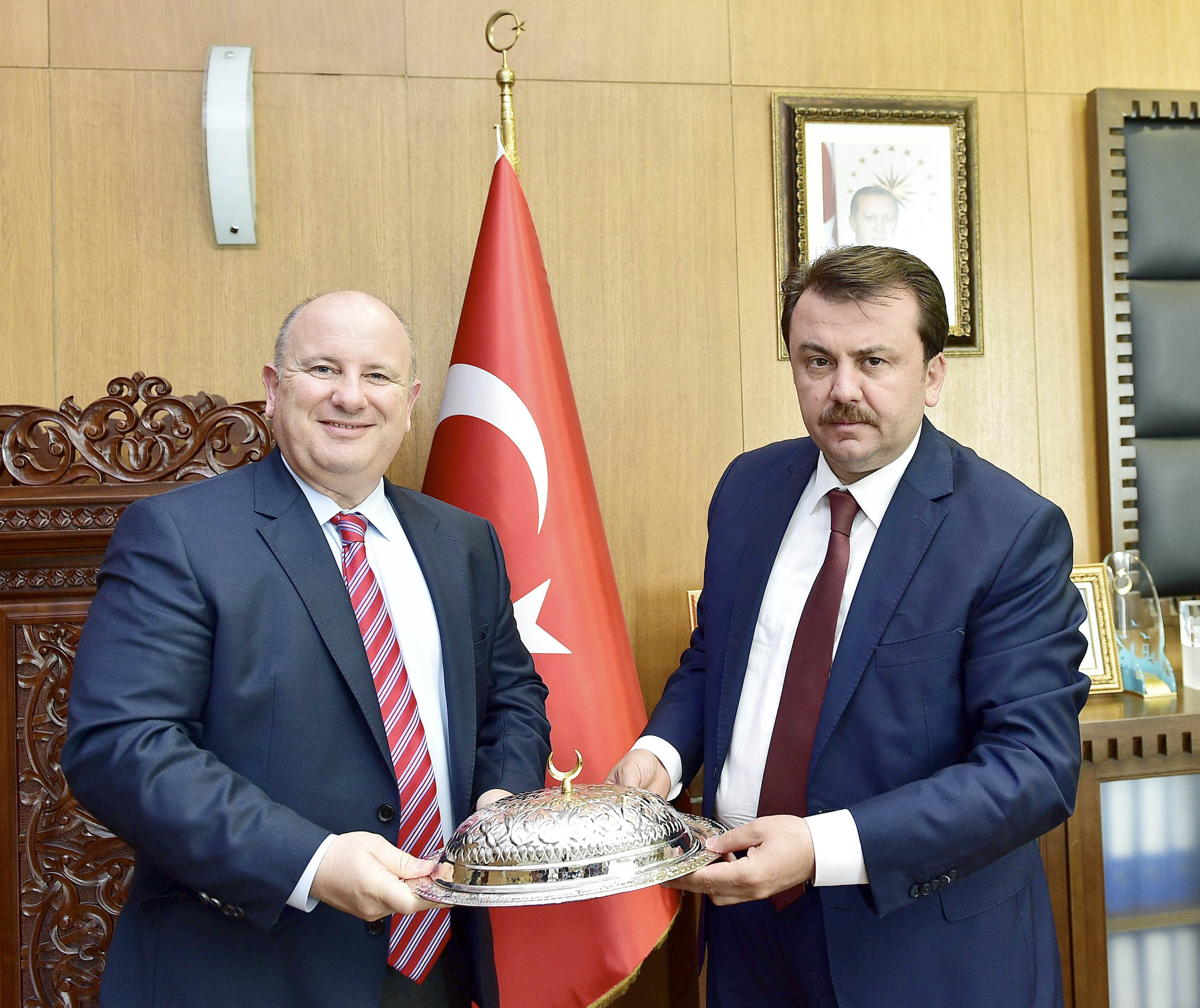 Ziyaretin sonunda Başkan Erkoç, ziyaretin anısına Devlet Eski Bakanı Kürşat Tüzmen ve Ersan Petrol Sanayi Yönetim Kurulu Başkanı Ecvet Sayer’e Maraş işi Bakır Kayık Tabak hediye ederek teşekkür etti.