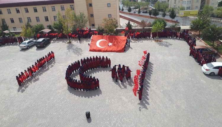 Okul bahçesinde Cuma günü bedenleriyle Türk Bayrağındaki ay ve yıldızın koreografisini oluşturan öğrencilere okul idarecileri de büyük destek verdi.