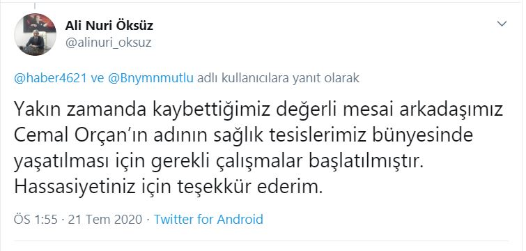 Kahramanmaraş İl Sağlık Müdürü Ali Nuri Öksüz yaptığı açıklamada: “Yakın zamanda kaybettiğimiz değerli mesai arkadaşımız Cemal Orçan’ın adının sağlık tesislerimiz bünyesinde yaşatılması için gerekli çalışmalar başlatılmıştır.” ifadelerine yer verdi.