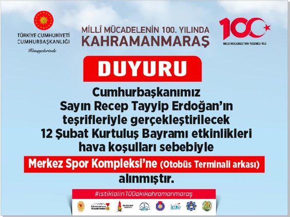 Kahramanmaraş Büyükşehir Belediyesi’nden yapılan yazılı açıklamada: “Daha önce 12 Şubat Stadyumu’nda gerçekleştirilmesi planlanan Kurtuluşun 100. Yılı final Programı hava hava koşulları sebebiyle Kahramanmaraş Otogarı arkasında bulunan Merkez Spor Kompleksinde gerçekleştirilecektir. Cumhurbaşkanımız Sayın Recep Tayyip Erdoğan’ın katılımı ile Merkez Spor Kompleksi’nde gerçekleştirilecek program saat 13.00’te başlayacaktır. Tüm halkımıza duyurulur” denilerek bilgi verildi.