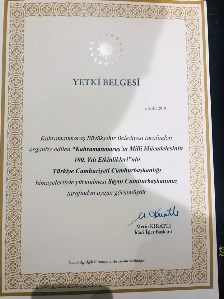 Kahramanmaraş’ın düşman işgalinden kurtuluşunun 100. Yılı kutlama etkinliklerinin Cumhurbaşkanlığı himayelerinde gerçekleştirileceği belirtildi. Büyükşehir Belediyesi’nden yapılan açıklamada: “İlimizi düşman işgalinden kurtuluşunun 100. Yılı kutlama etkinliklerinin Türkiye Cumhuriyeti Cumhurbaşkanlığı himayelerinde yürütülmesi Sayın Cumhurbaşkanımız tarafından uygun görülmüştür” denilerek bilgi verildi.