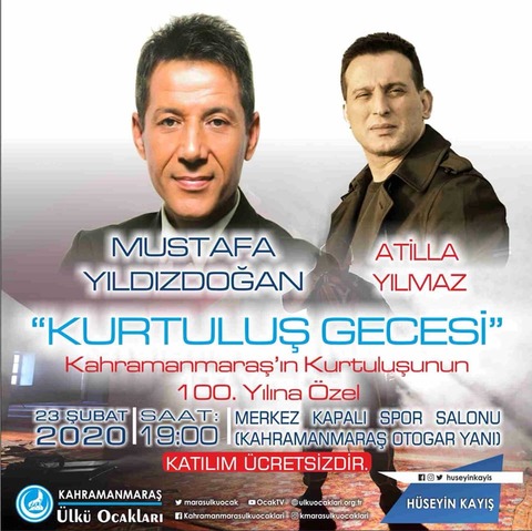 Kahramanmaraş Ülkü Ocakları düzenlediği “Kurtuluş Gecesi”nde sahne alacak olan Mustafa Yıldızdoğan’a Atilla Yılmaz eşlik edecek. Daha önce vereceği konser şehitler dolayısıyla ertelenmişti.