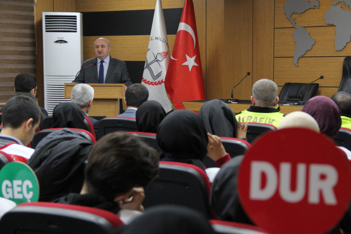 Emniyet Müdürlüğü Trafik Tescil ve Denetleme Şube Müdürü Hakan Doğan konuşmasında; “Trafik sorunu yaralanma, can ve mal kaybı gibi tüm dünya ülkelerinin mücadele ettiği genel bir halk sağlığı sorunudur. Güvenli bir trafik sistemi oluşturulabilmesi için trafiğin aktif unsurları olan insan hatalarının önlenmesi görevimiz açısından büyük önem taşımaktadır. Trafik güvenliğinin sağlanması ve trafik kazalarının önlenmesi için kamu kurum ve kuruluşları siz okul geçidi görevlilerine önemli görev ve sorumluluklar düşmektedir. 2918 sayılı Karayolları Trafik Kanununu ve Karayolları Trafik Kanununun 178.maddesi bizim için çok önemlidir.” İfadelerine bitirdi