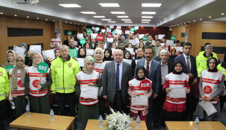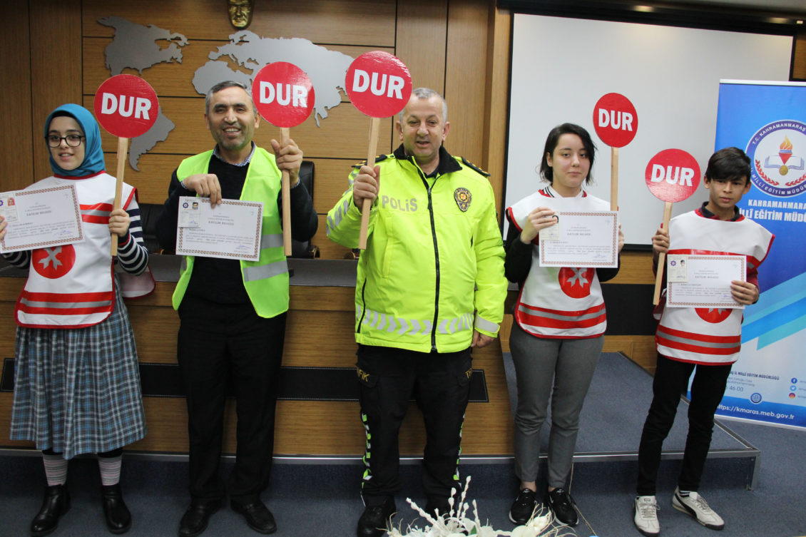 Kahramanmaraş‘ta “Okul Geçit Görevlileri Projesi” eğitimini başarı ile tamamlayan 74 kursiyerimizin belge dağıtım töreni Kahramanmaraş İl Milli Eğitim Müdürü Cemal Yılmaz, Kahramanmaraş İl Emniyet Müdür Yardımcısı Mehmet Çeribaş, Emniyet Müdürlüğü Trafik Tescil ve Denetleme Şube Müdürü Hakan Doğan, İl Milli Eğitim Müdür Yardımcıları, İl/İlçe Şube Müdürleri, okul idarecileri, öğretmenler ve öğrencilerin katılımıyla gerçekleştirildi.