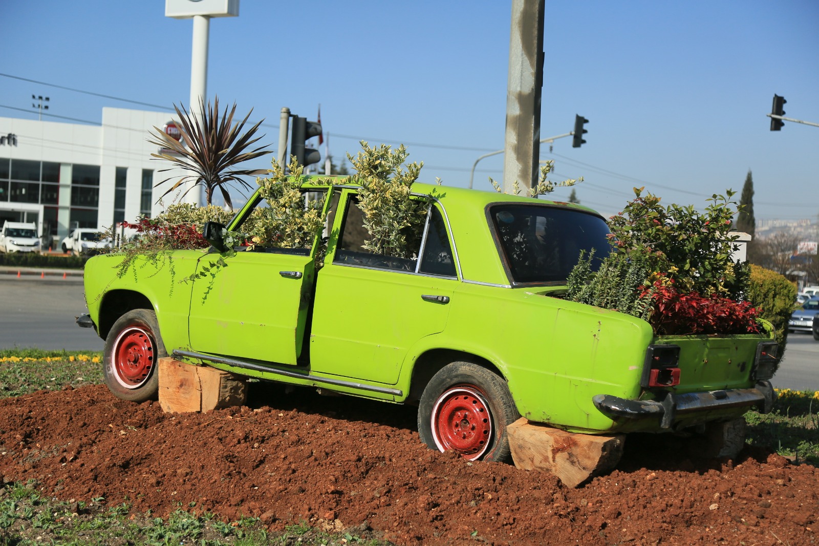 Park ve Bahçeler Dairesi Başkanlığı ekipleri tarafından Sanayi kavşağında gerçekleştirilen peyzaj çalışmaları kapsamında hurda bir otomobil çiçek saksısı gibi kullanılırken, etrafına da mevsimlik çiçeklerle bezeme yapıldı.