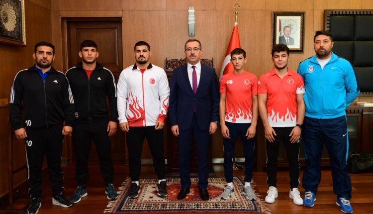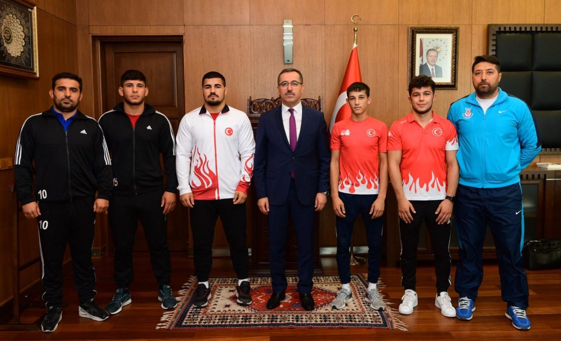 Kahramanmaraş Büyükşehir Belediye Başkanı Hayrettin Güngör, Bulgaristan’da düzenlenen Gençler Balkan Güreş Şampiyonası’nda milli takım formasıyla mücadele eden sporcularla bir araya geldi. Başarıları dolayısıyla tüm takımı tebrik eden Başkan Güngör, “Kahramanmaraşlı güreşçilerimiz milli takım formasıyla 4 altın madalya kazandı. Turnuvaya katılan tüm sporcularımızı tebrik ediyor, başarılarının devamını diliyorum” ifadelerini kullandı.