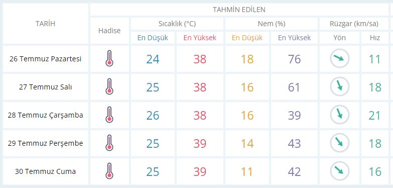 26 Temmuz Pazartesi günü en düşük sıcaklık 24 derece, en yüksek sıcaklık ise 38 derece açık ve sıcak olacak.