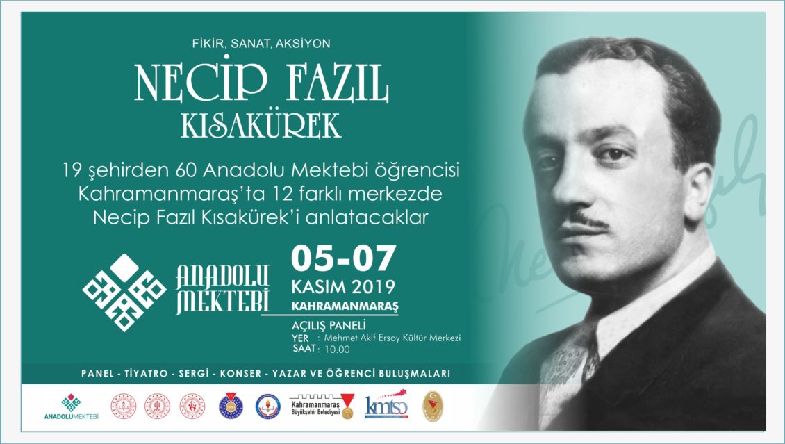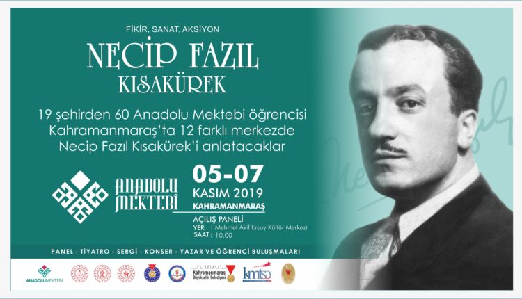 Kahramanmaraş Büyükşehir Belediyesi ve Anadolu Mektebi işbirliği ile 5-7 Kasım tarihleri arasında 19 şehirden 60 Anadolu Mektebi öğrencisi şehirde Necip Fazıl Kısakürek’i anlatacak. 12 farklı merkezde gerçekleştirilecek etkinliklerle ilgili Büyükşehir Belediyesi’nden yapılan açıklamada, “Programın açılış paneli 5 Kasım Salı günü saat 10.00’da Mehmet Akif Ersoy Kültür Merkezi’nde yapılacak. Panel, tiyatro, sergi, konser, yazar ve öğrenci buluşmalarını kapsayan etkinliklere tüm hemşerilerimiz davetlidir” denildi.