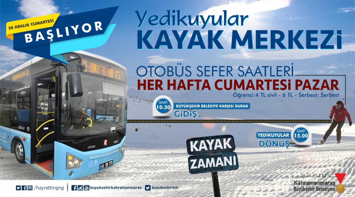 Kahramanmaraş Büyükşehir Belediyesi Yedikuyular Kayak Merkezi’ne gitmek isteyen vatandaşlar için otobüs seferlerinin 28 Aralık Cumartesi günü başlayacağını duyurdu. Büyükşehir Belediyesi’nden konu ile alakalı yapılan açıklamada: “Yedikuyular Kayak Merkezi’ne hafta sonu Cumartesi ve Pazar günleri olmak üzere haftada iki gün otobüs seferi konulmuştur. Yedikuyulara gitmek isteyen vatandaşlarımız Cumartesi ve Pazar günü saat 10.30’da Büyükşehir Belediyesi karşısındaki duraktan binebilirler. Yedikuyular Kayak Merkezi’nden ise geri dönüş saat 15.00 olarak belirlenmiştir. Yedikuyular Kayak Merkezi’ne gidiş ücreti öğrenci 4 TL, sivil ise 6 TL olarak belirlenirken, serbest kart sahipleri ise ücretsiz olarak gidecektir” denilerek bilgi verildi.