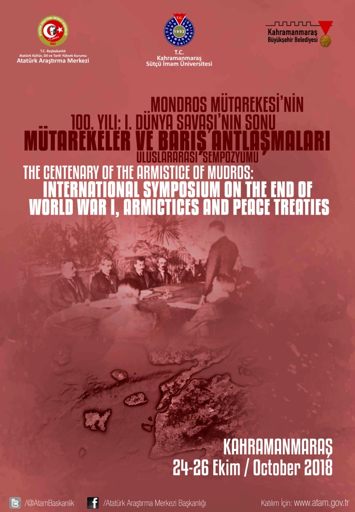 Kahramanmaraş Büyükşehir Belediyesi, Kahramanmaraş Sütçü İmam Üniversitesi ve Atatürk Araştırma Merkezi işbirliği ile gerçekleştirilecek olan ‘I.Dünya Savaşı Sonu: Mütarekeler ve Barış Antlaşmaları Uluslararası Sempozyumu’ 24-26 Ekim 2018 günü yapılması planlanmaktadır.