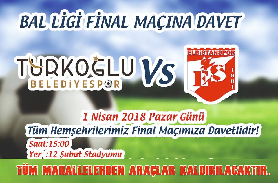 Türkoğlu Belediyespor BAL Ligi yolunda play offun final maçında 1 Nisan Pazar günü saat 15:00 te 12 Şubat Stadyumunda Elbistan Belediyespor ile karşılaşacak. Kazanan takımın direkt BAL Ligine yükseleceği maçta taraftarların desteği çok önemli. Bu nedenle maça gelerek Türkoğlu Belediyespor’a destek olmak isteyenler için Türkoğlu ilçemizin bütün mahallelerinden araç kaldırılacak.