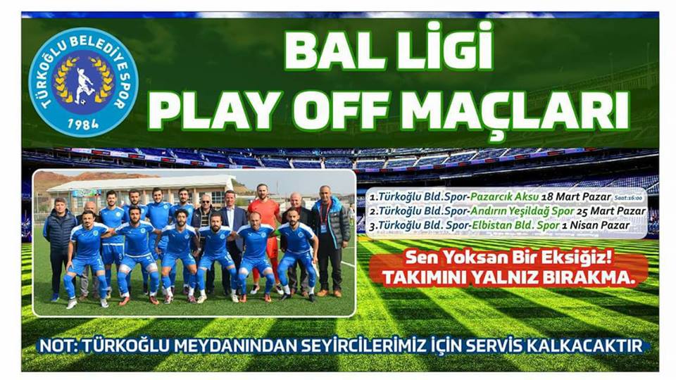 Kahramanmaraş 1. Amatör Küme B Grubunu lider tamamlayan Türkoğlu Belediyespor BAL Ligi için play of maçlarına çıkıyor. Tek devreli lig usülüne göre oynanacak maçlarda ilk rakip Pazarcık Aksuspor. Bugün saat 16:00 da Kahramanmaraş Batıpark Stadında oynanacak maça gitmek isteyenler için saat 14:00 (2) de Türkoğlu Kent meydanından araç kaldırılacaktır.