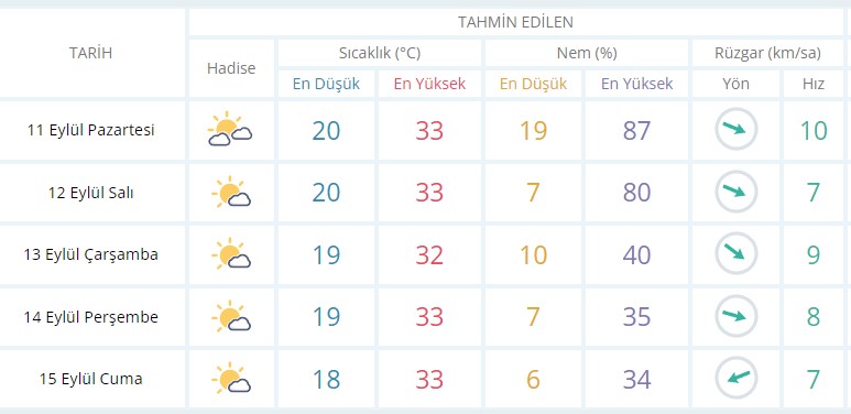 14 Eylül Perşembe günü en düşük sıcaklık 19 derece, en yüksek sıcaklık ise 33 derece açık ve az bulutlu olacak.