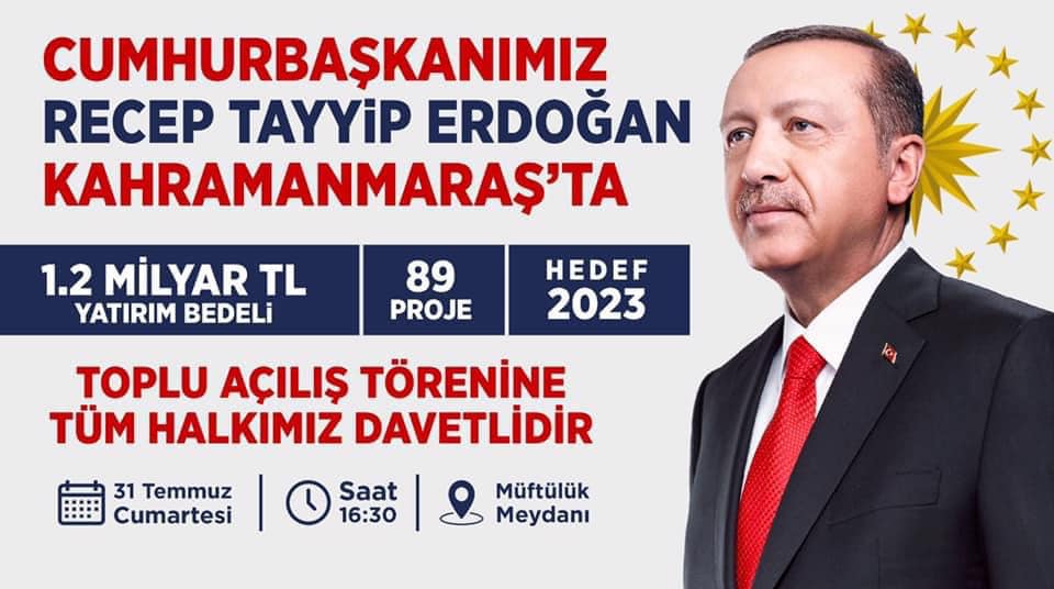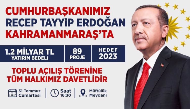 Cumhurbaşkanı Recep Tayyip Erdoğan, 31 Temmuz Cumartesi günü Kahramanmaraşlılarla buluşacak. Müftülük Meydanı’nda gerçekleştirilecek Toplu Açılış Töreni’nde 1,2 Milyar TL’lik yatırımlar hizmete alınacak.