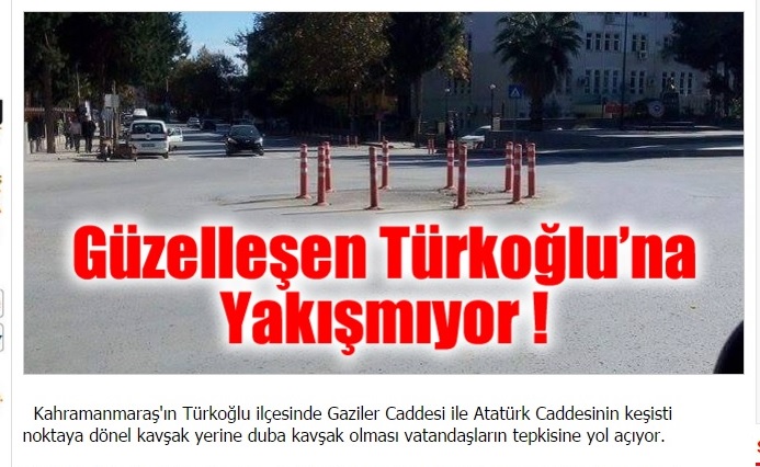 “Kahramanmaraş’ın Türkoğlu ilçesinde Gaziler Caddesi ile Atatürk Caddesinin keşisti noktaya dönel kavşak yerine duba kavşak olması vatandaşların tepkisine yol açıyor. Türkoğlu Belediyesi tarafından yol düzenleme çalışmaları kapsamında ilçenin merkezi konumunda ki ana yolda yolun orta kısmında kavşak amacıyla kullanılan ”Kırmızı Dubaların” çirkin görüntüler oluşmasına yol açarken vatandaşlar. ”Türkoğlu ilçe belediye başkanı Okumuş, ilçemizi güzelleştirmek adına çaba sarf ettiğini biliyoruz ve görüyoruz. İlçemizin bu ana yol üzerinde ki bu çirkin görüntüye sebep olan kavşağın biran önce düzeltilmesini istediklerini dile getirdiler.” ifadelerine yer verilen haber sosyal medya üzerinden paylaşılmayan devam ediyor.