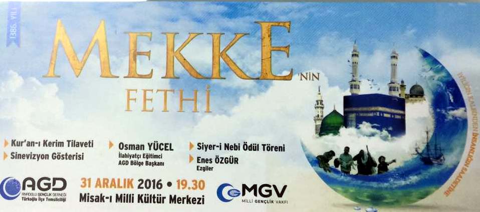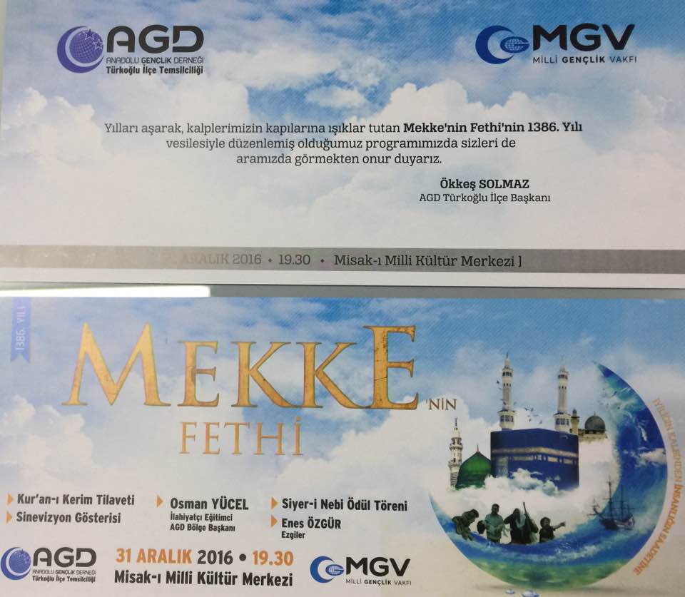 Anadolu Gençlik Derneği Türkoğlu temsilciliği tarafından düzenlenen Mekke’nin Fethi Programına tüm Türkoğlu halkı davetlidir.