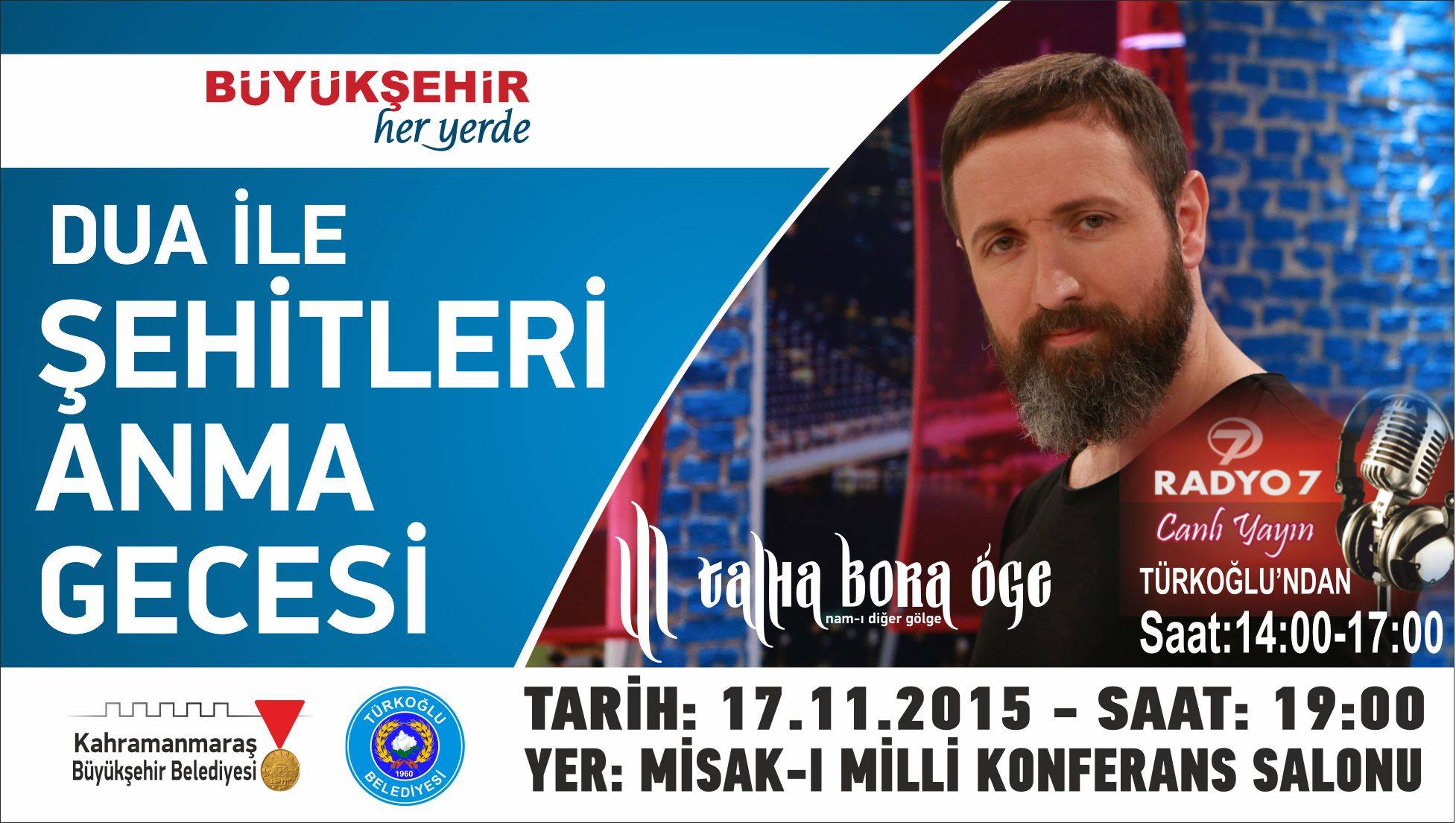 Ayrıca aynı saat 14:00 ile 17:00 arasında Radyo 7’de Talha Bora Öge Nam-ı Diğer Gölge programı canlı olarak Türkoğlu ilçemizden yapılacaktır.