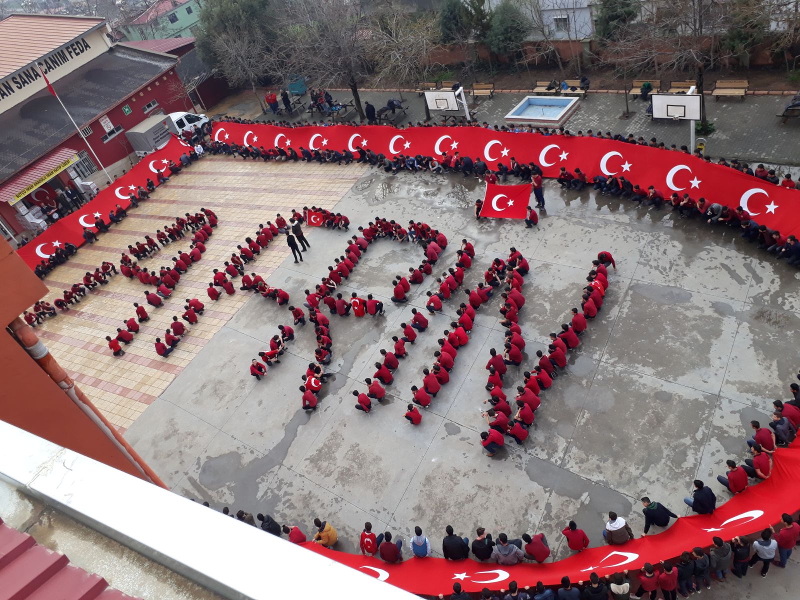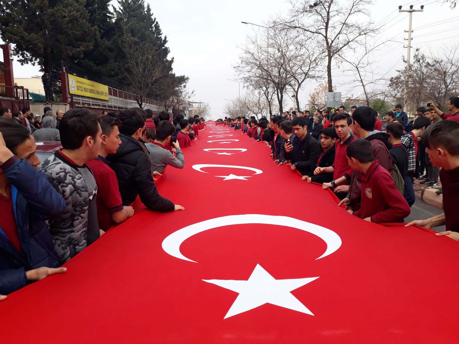 Yapılan etkinlikte okul öğrencileri oluşturdukları kareografi çalışması ile Afrin’deki Mehmetçiğe selam gönderdiler. Daha sonra, öğrenciler tarafından tekbirler eşliğinde komanda marşı okundu. 100 metrelik Türk Bayrağını okul dışında cadde boyunca taşıyan öğrencilere halkımız büyük bir ilgi gösterdi.